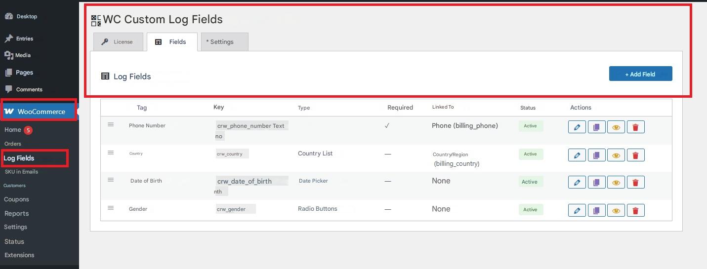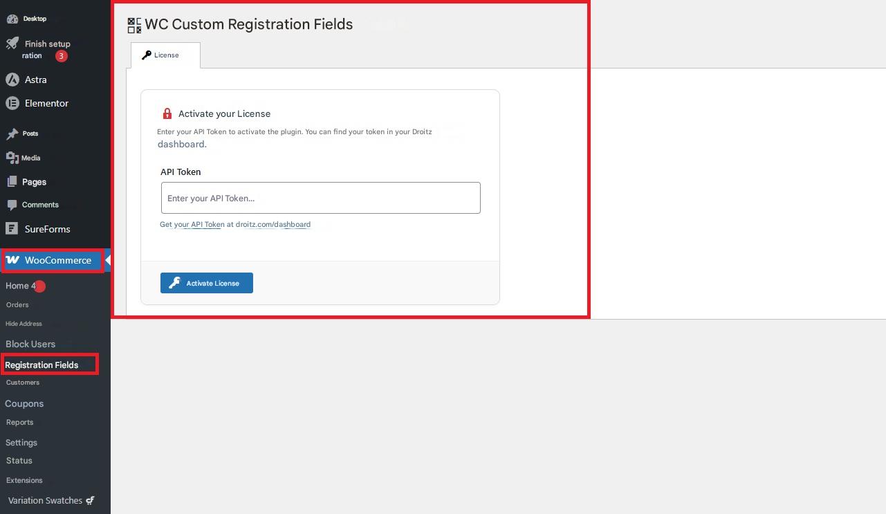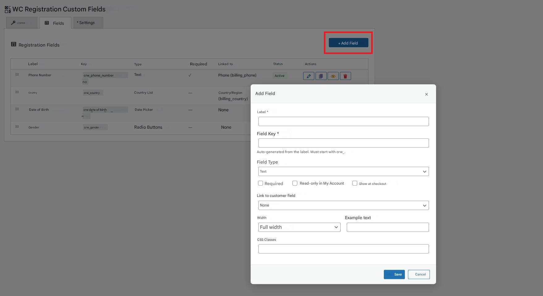 - Go to WooCommerce → Registration fields in your WordPress dashboard.