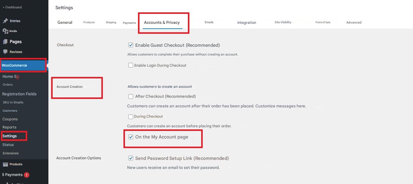 - Enable account creation: Go to WooCommerce > Settings > Accounts & Privacy, and in the account creation section, enable the “On the ‘My Account’ page” option. This will allow users to sign up directly from that page.
