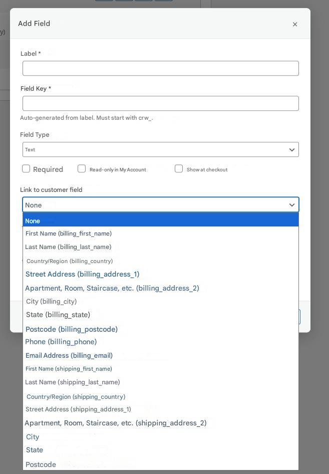 In the list of fields, options such as billing and shipping will appear in parentheses, indicating what type of field they can be linked to: