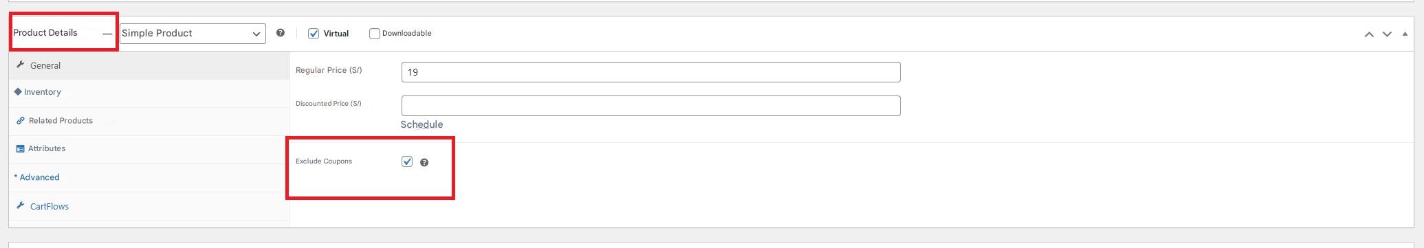 Once inside the product, go to the Product Details section and select the Exclude coupons option .